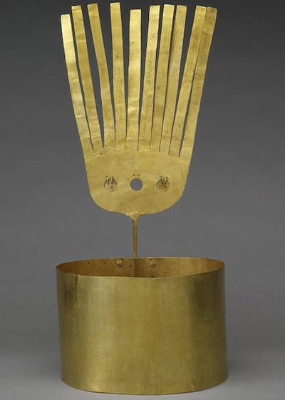 Dr McEwan explained that the crown ‘was clearly used by a person of high status as an emblem of lordly or royal authority forming part of a suite of golden regalia, along with bracelets and anklets’. Stylistic details suggest that the crown belongs to a pre-Inca Northern Andean gold-working tradition, which encompassed the coast and northern highlands of Peru and the southern highlands of Ecuador. Dr McEwan said, ‘One hypothesis therefore is that the crown could have been worn by a Cañari lord well before the Inca invasion in the 15th century.’ – www.royalcollection.org.uk