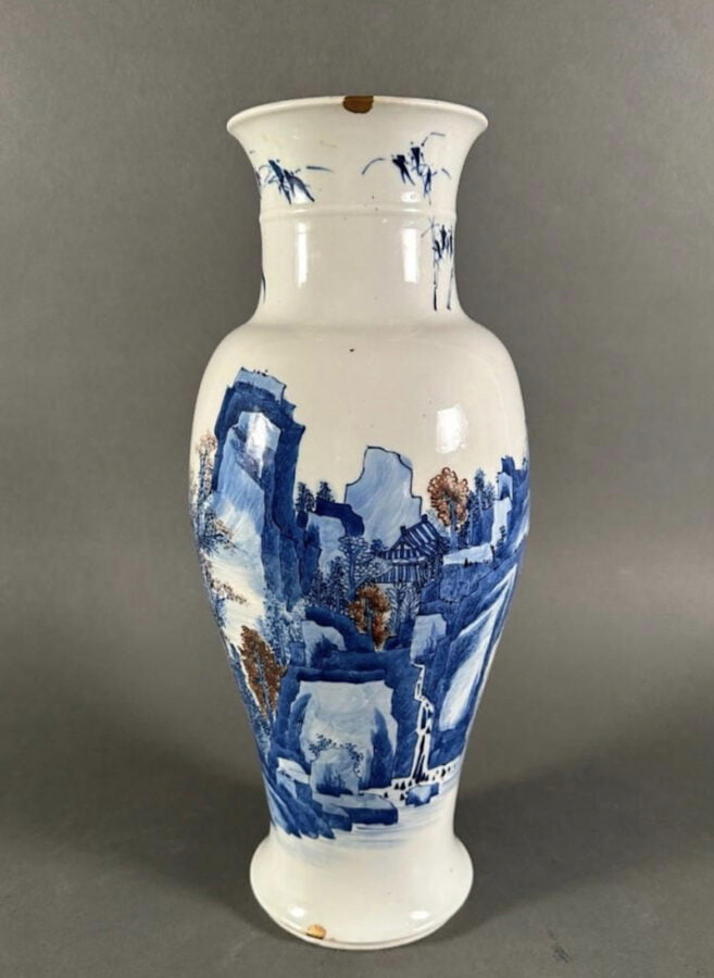 The Chinese porcelain vase came into the sale with a $100/$300 estimate and ended up being the overall top lot. It was probably early 20th century and was nicely decorated with a landscape of a scholar boating on a lake to view the autumn moon. It was predominantly painted in underglaze cobalt; copper red was used for the trees and moon to emphasize the season and the time of day.